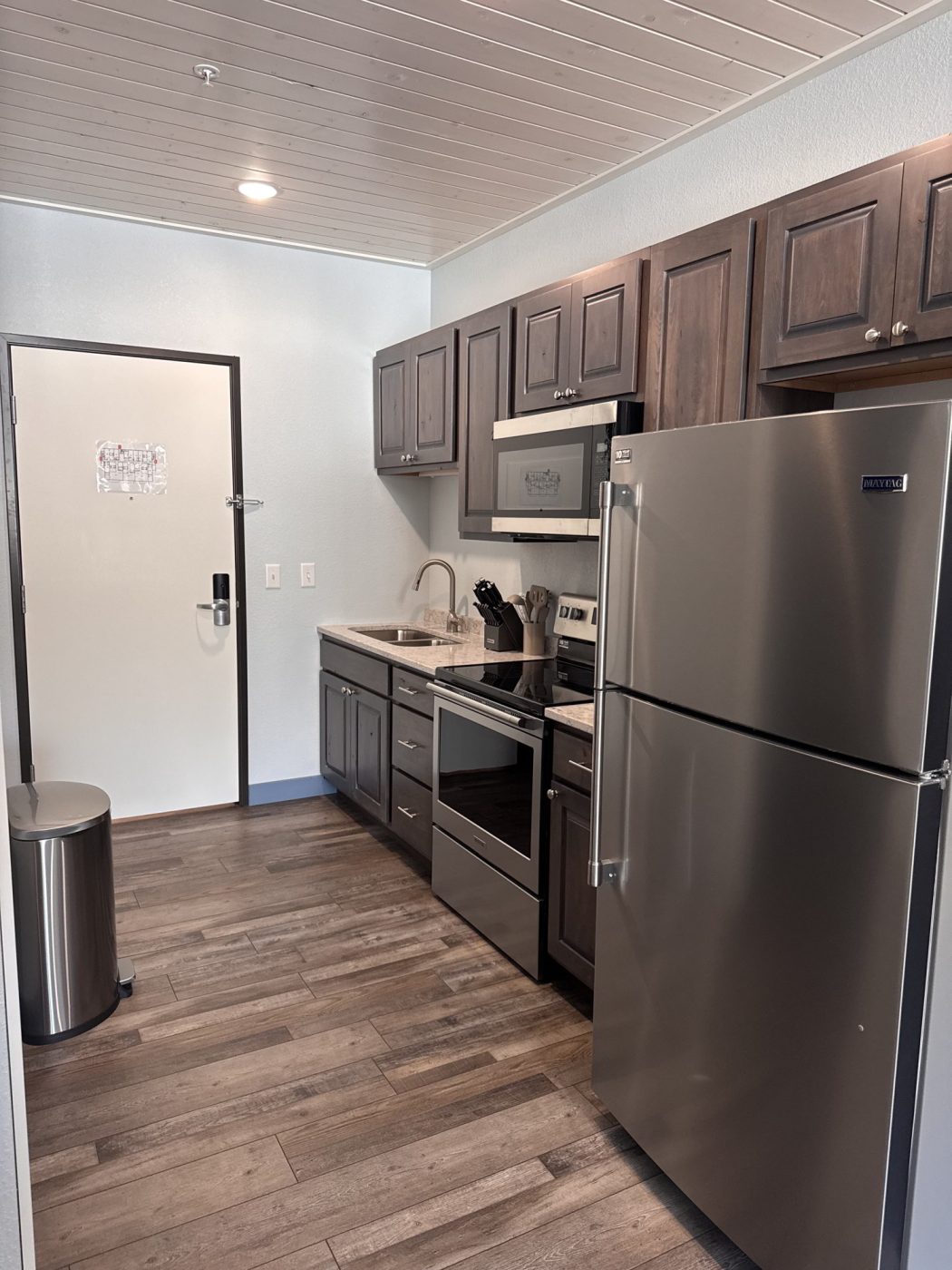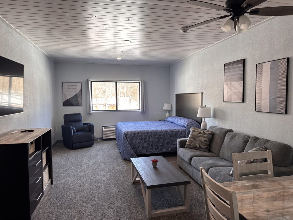 A one room, one bathroom Cabin View Lodge Suite features a fully equipped kitchen, air conditioning, and a comfortable living room. A lakeside fire ring is available to lodge guests along with charcoal grills and picnic tables upon request at no charge. Sleeps 2-4.