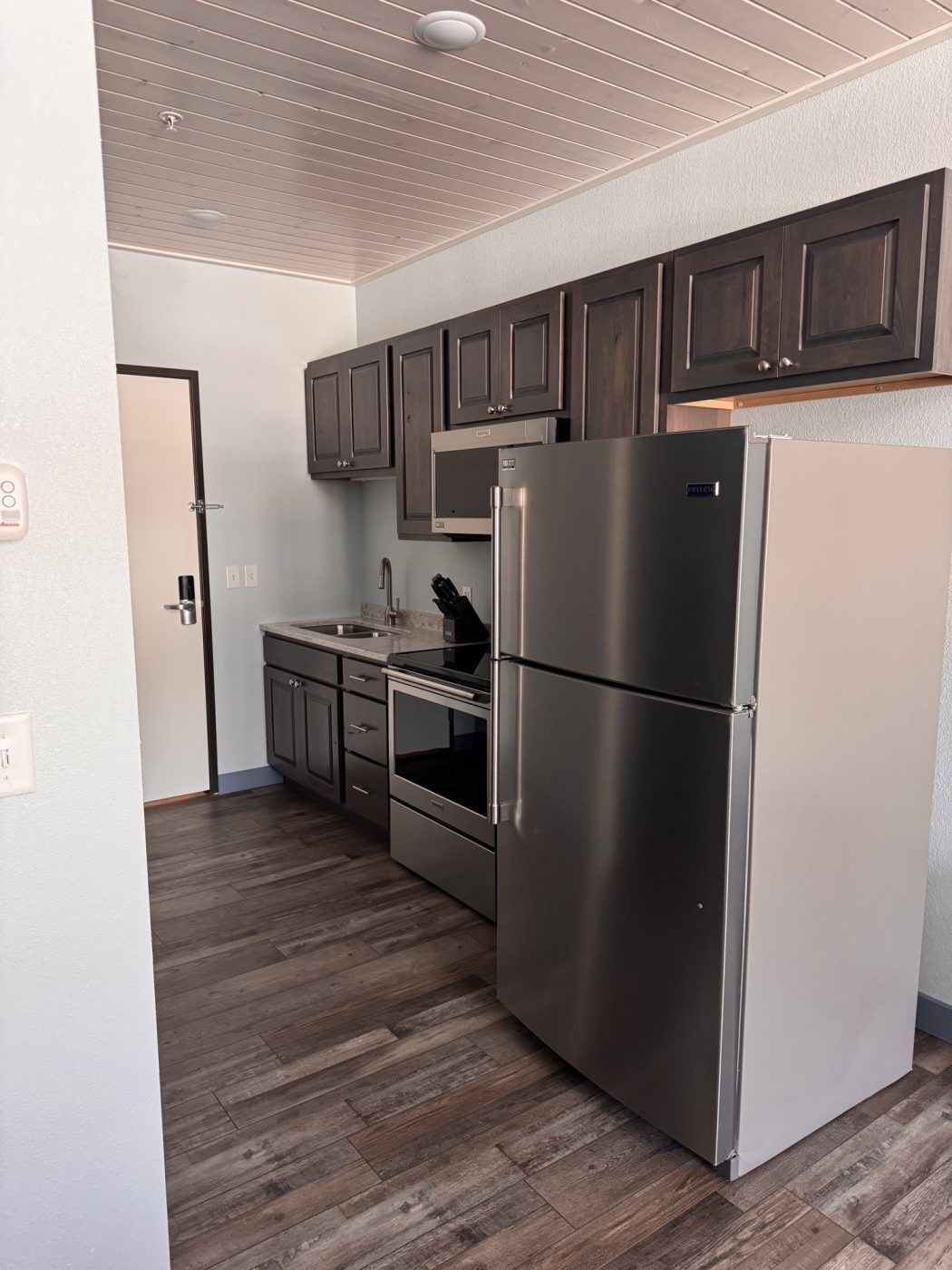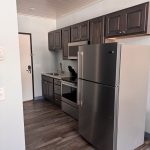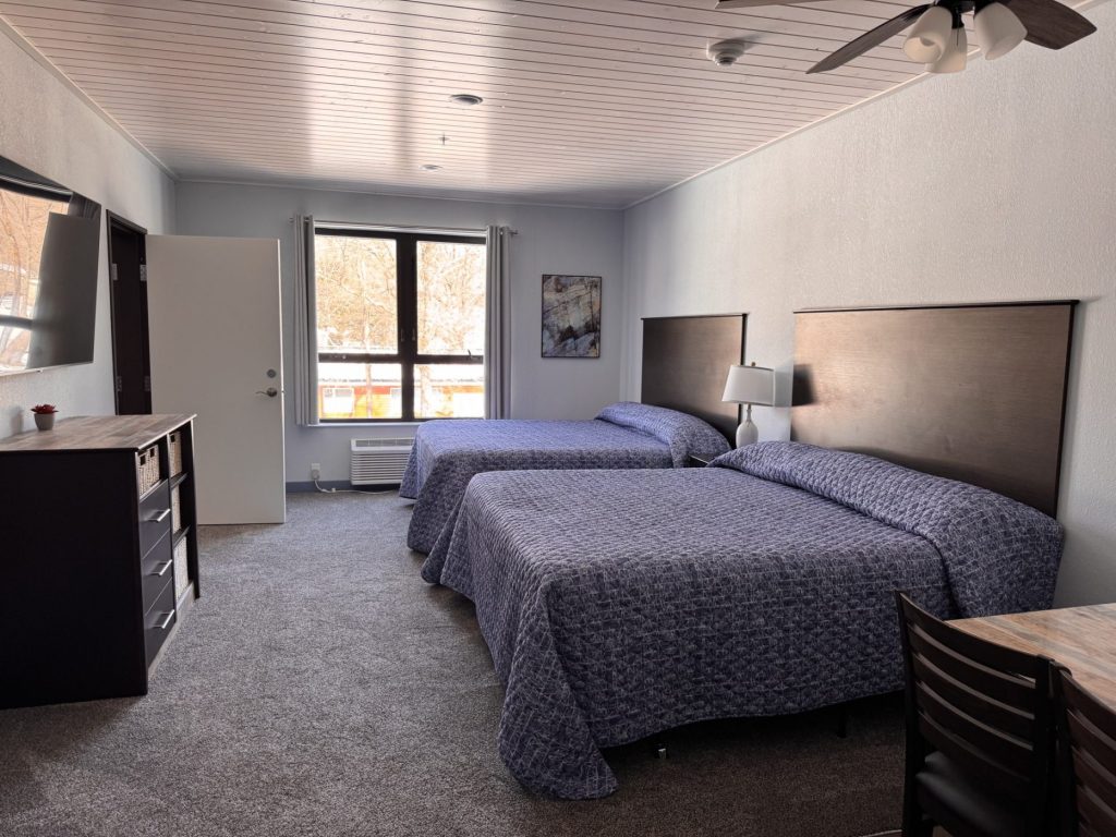 A One Room, One Bathroom cabin view Lodge Suite; At Hiawatha Beach, features a fully equipped kitchen, air conditioning, and a comfortable living room in all cabins and suites. This suite has the ability to connect to Suite 208 for larger families. A lakeside fire ring is available to lodge dwellers along with charcoal grills and picnic tables upon request at no charge. (Sleeps 4)